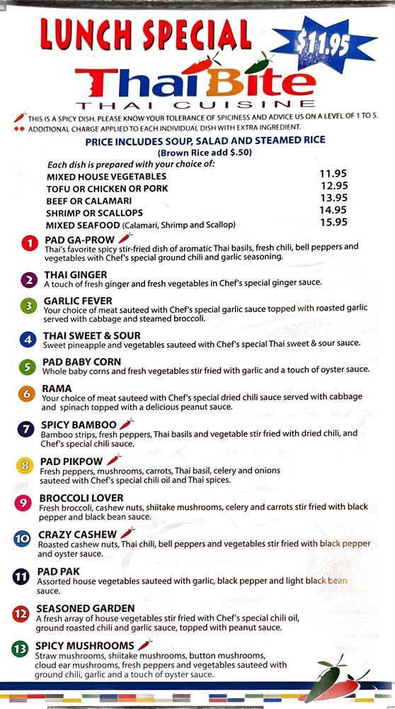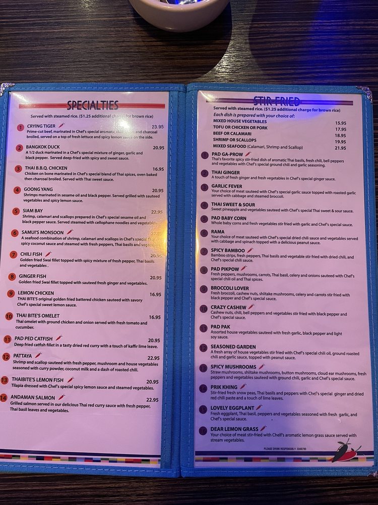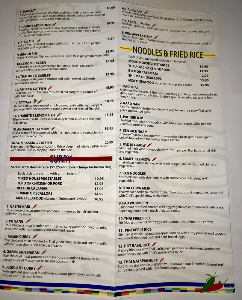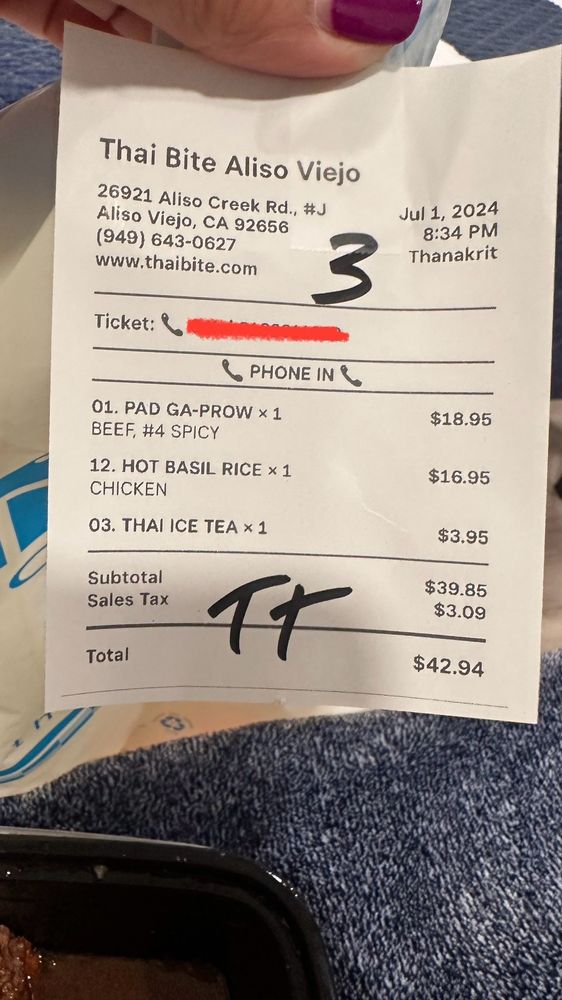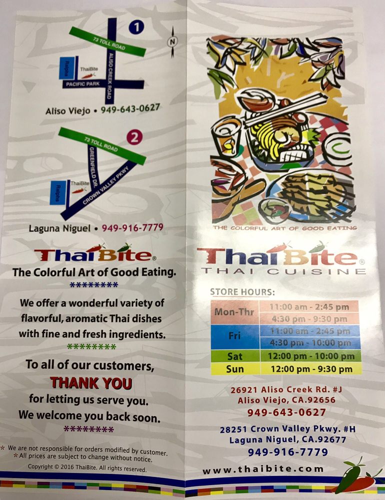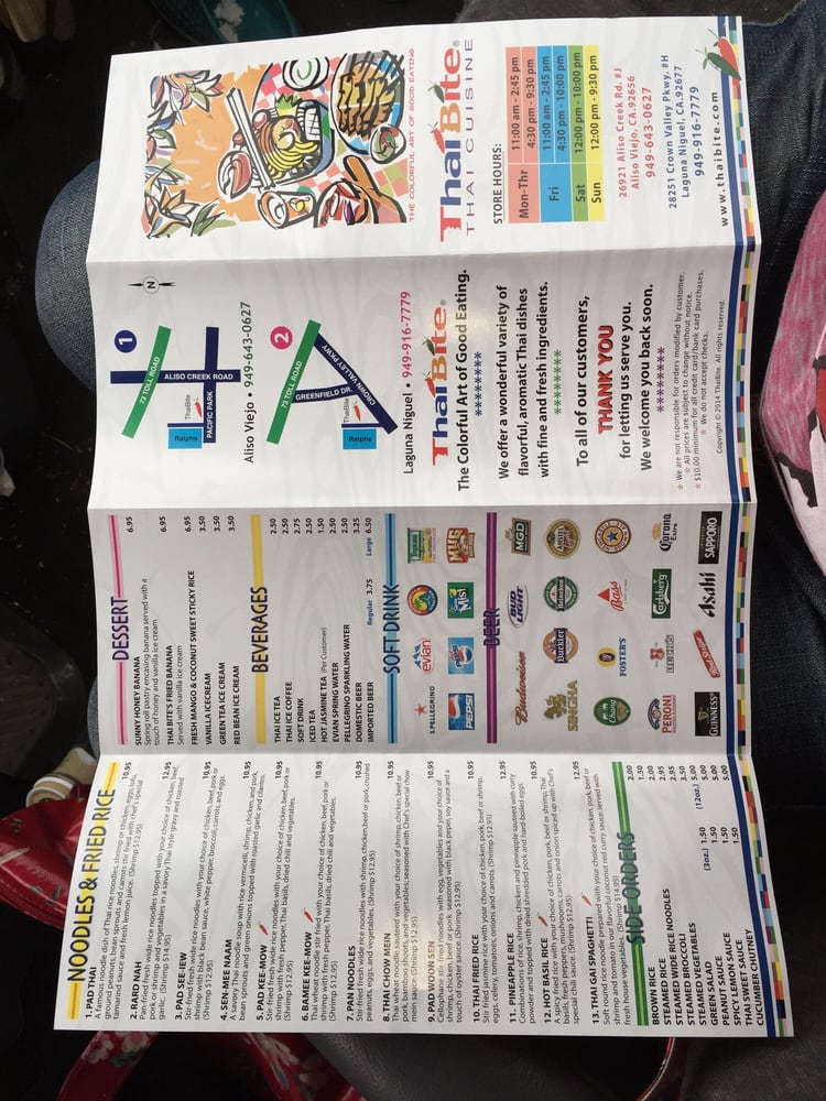 Welcome to Thai Bite, where you can indulge in a variety of delicious Thai dishes in a casual yet vibrant setting. Located at 26921 Aliso Creek Rd Ste J in Aliso Viejo, CA, Thai Bite offers a range of amenities such as reservations, takeout, delivery, vegan and vegetarian options, wheelchair access, and more. Customers rave about the flavorful Pad Thai, Crying Tiger, yellow curry, and lunch specials. The service is quick, prices are reasonable, and the portions are generous. With a cozy atmosphere and attentive staff, Thai Bite provides a memorable dining experience for all. Whether you're in the mood for a traditional Thai dish or looking to explore new flavors, Thai Bite is a must-visit spot for authentic and satisfying cuisine.